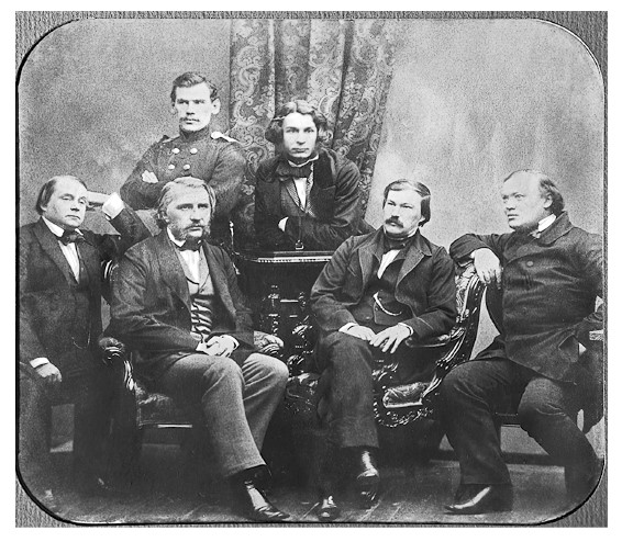 Групповой портрет писателей – членов редколлегии журнала «Современник». Во втором ряду: Лев Толстой и Дмитрий Григорович. Сидят: Иван Гончаров, Иван Тургенев, Александр Дружинин и Александр Островский. 1856 год. Фотография Сергея Левицкого[7]