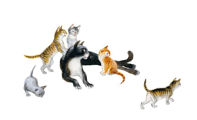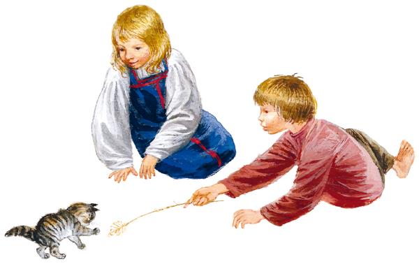 Были брат и сестра – Вася и Катя; и у них была кошка. Весной кошка пропала. Дети искали её везде, но не могли найти. Один раз они играли подле амбара и услыхали, над головой что-то мяучит тонкими голосами. Вася влез по лестнице под крышу амбара. А Катя стояла внизу и всё спрашивала: «Нашёл? Нашёл?» Но Вася не отвечал ей. Наконец, Вася закричал ей: «Нашёл! наша кошка… и у неё котята; такие чудесные; иди сюда скорее». Катя побежала домой, достала молока и принесла кошке.