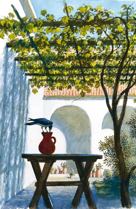Хотела галка пить. На дворе стоял кувшин с водой, а в кувшине была вода только на дне. Галке нельзя было достать.