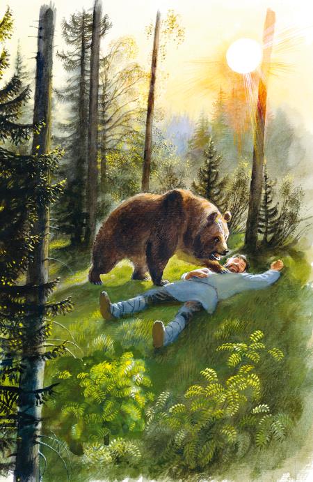 Медведь подошёл к нему и стал нюхать: он и дышать перестал.