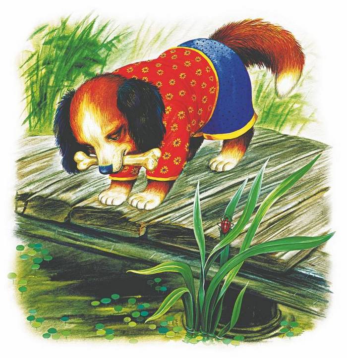 Несла Жучка кость через мост. Глядь, в воде её тень. Пришло Жучке на ум, что в воде не тень, а Жучка и кость. Она и пусти кость, чтобы ту взять. Ту не взяла, а своя ко дну пошла.