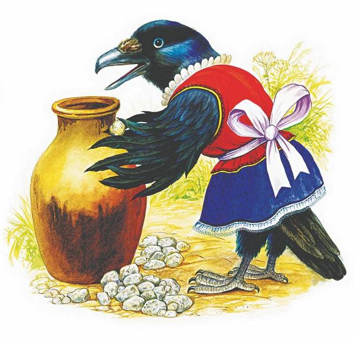 Хотела галка пить. На дворе стоял кувшин с водой, а в кувшине была вода только на дне. Галке нельзя было достать. Она стала кидать в кувшин камушки и столько набросала, что вода стала выше и можно было пить.