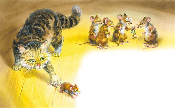 – Я вам скажу, как нам от кота спастись. Ведь мы потому и гибнем, что не знаем, когда он к нам идёт. Надо коту на шею звонок надеть, чтобы он гремел. Тогда всякий раз, как он будет от нас близко, нам слышно станет, и мы уйдём.