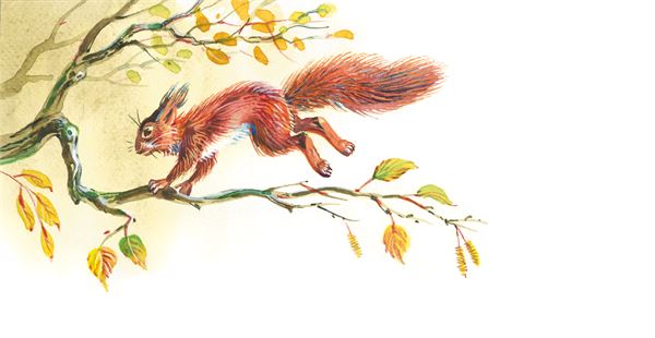 Белка прыгала с ветки на ветку и упала прямо на сонного волка. Волк вскочил и хотел её съесть. Белка стала просить:
