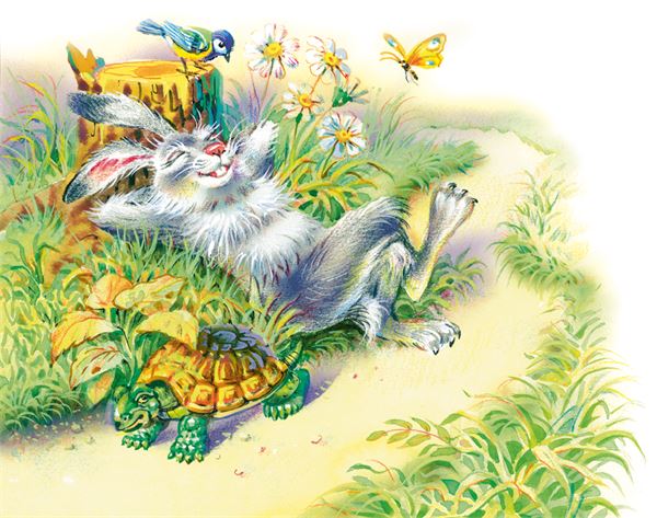 Поспорили заяц с черепахой, кто кого обгонит. Взялись они бежать на версту. Заяц сразу обогнал черепаху, так что её и не видно стало.