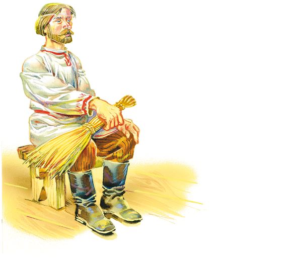 Работник пошёл, положил у порога чурбан и сел на завалинку, стал дожидаться, пока народ будет выходить из избы.