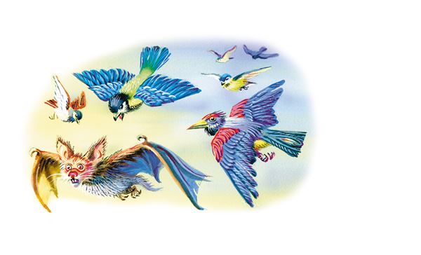 Летучая мышь не пристала ни к тем, ни к другим и всё выжидала, чья возьмёт. Сначала птицы стали побивать зверей, и тогда летучая мышь пристала к птицам, летала с ними и называла себя птицей, но потом, когда звери стали одолевать, летучая мышь передалась зверям. Она показала им свои зубы, и лапы, и соски и уверяла, что она зверь и зверей любит. Под конец всё-таки птицы победили, и тогда летучая мышь опять передалась птицам, но птицы прогнали её. И к зверям ей уже пристать нельзя было, и с тех пор летучая мышь живёт по погребам, по дуплам, и летает только сумерками, и не пристаёт ни к зверям, ни к птицам.