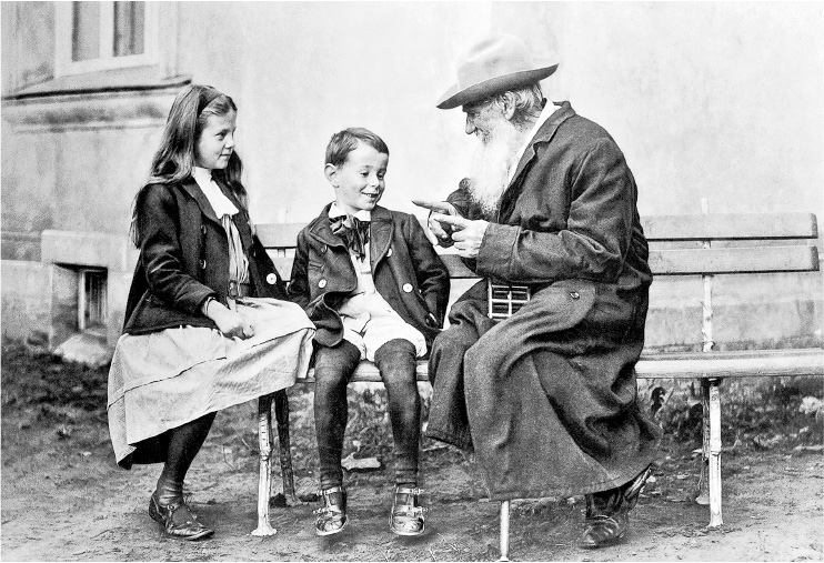 Лев Толстой рассказывает сказку об огурце внукам Соне и Илюше. 1909 год[10]