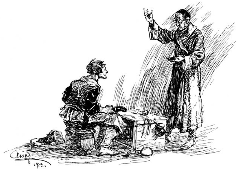 Вернувшись в классную, Карл Иваныч велел мне встать и приготовить тетрадь для писания под диктовку. Когда все было готово, он величественно опустился в свое кресло и голосом, который, казалось, выходил из какой-то глубины, начал диктовать следующее: «Von al-len Lei-den-schaf-ten die grau-sam-ste ist… haben sie geschrieben?»[13] Здесь он остановился, медленно понюхал табаку и продолжал с новой силой: «Die grausamste ist, die Un-dank-bar-keit… Ein grosses U»[14]. В ожидании продолжения, написав последнее слово, я посмотрел на него.