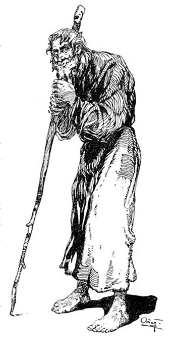 В комнату вошел человек лет пятидесяти, с бледным, изрытым оспою продолговатым лицом, длинными седыми волосами и редкой рыжеватой бородкой. Он был такого большого роста, что для того, чтобы пройти в дверь, ему не только нужно было нагнуть голову, но и согнуться всем телом. На нем было надето что-то изорванное, похожее на кафтан и на подрясник; в руке он держал огромный посох. Войдя в комнату, он из всех сил стукнул им по полу и, скривив брови и чрезмерно раскрыв рот, захохотал самым страшным и неестественным образом. Он был крив на один глаз, и белый зрачок этого глаза прыгал беспрестанно и придавал его и без того некрасивому лицу еще более отвратительное выражение.