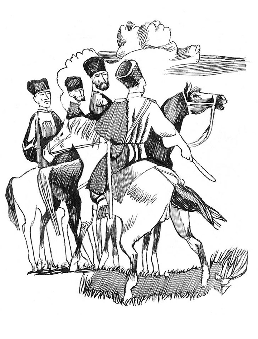 Был позван горнист, у которого находилась водка и закуска. Спокойствие и равнодушие капитана невольно отразились и на мне. Мы ели жареного фазана и разговаривали, нисколько не помышляя о том, что люди, которым принадлежит сакля, не только не желали видеть нас тут, но едва ли могли предполагать возможность нашего существования.