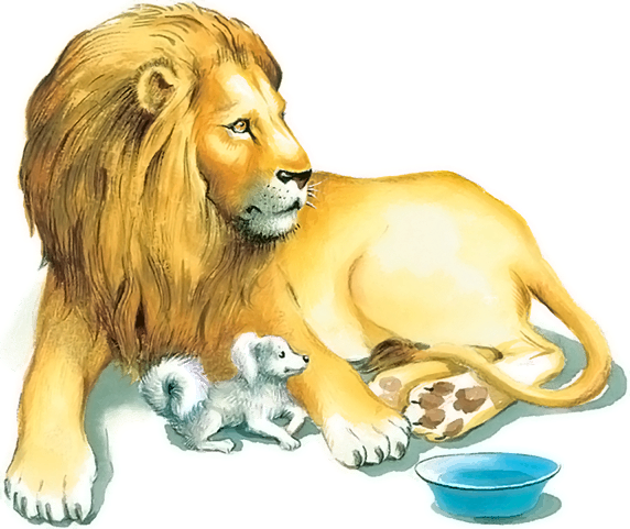 С тех пор собачка жила в одной клетке со львом, лев не трогал её, ел корм, спал с ней вместе, а иногда играл с ней.