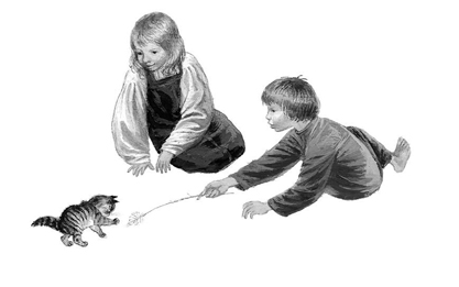 Были брат и сестра – Вася и Катя; и у них была кошка. Весной кошка пропала. Дети искали её везде, но не могли найти. Один раз они играли подле амбара и услыхали, над головой что-то мяучит тонкими голосами. Вася влез по лестнице под крышу амбара. А Катя стояла внизу и всё спрашивала: «Нашёл? Нашёл?» Но Вася не отвечал ей. Наконец, Вася закричал ей: «Нашёл! наша кошка… и у неё котята; такие чудесные; иди сюда скорее». Катя побежала домой, достала молока и принесла кошке.