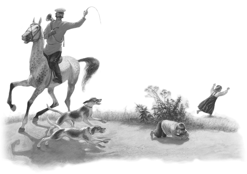 Ветер шевелил солому по дороге, а котёнок играл с соломой, и дети радовались на него. Потом они нашли подле дороги щавель, пошли собирать его и забыли про котёнка. Вдруг они услыхали, что кто-то громко кричит: «Назад, назад!» – и увидали, что скачет охотник, а впереди его две собаки увидали котёнка и хотят схватить его. А котёнок глупый, вместо того, чтобы бежать, присел к земле, сгорбил спину и смотрит на собак. Катя испугалась собак, закричала и побежала прочь от них. А Вася что было духу пустился к котёнку и в одно время с собаками подбежал к нему. Собаки хотели схватить котёнка, но Вася упал животом на котёнка и закрыл его от собак.