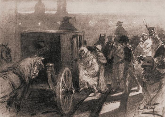 Княгиня, подбирая платье, садилась в темноте кареты; муж ее оправлял саблю; князь Ипполит, под предлогом прислуживания, мешал всем.