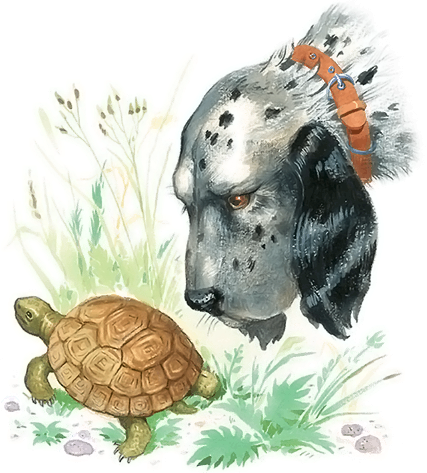 Один раз я пошёл с Мильтоном на охоту. Подле леса он начал искать, вытянул хвост, поднял уши и стал принюхиваться. Я приготовил ружьё и пошёл за ним. Я думал, что он ищет куропатку, фазана или зайца. Но Мильтон не пошёл в лес, а в поле. Я шёл за ним и глядел вперёд. Вдруг я увидал то, что он искал. Впереди его бежала небольшая черепаха, величиною с шапку. Голая тёмно-серая голова на длинной шее была вытянута, как пестик; черепаха широко перебирала голыми лапами, а спина её вся была покрыта корой.