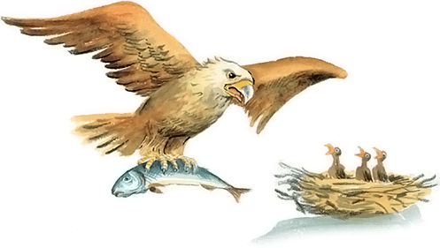 Орлята подняли головы и разинули рты, а орёл разорвал рыбу и накормил детей.