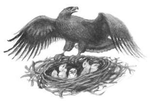 Орёл устал и не мог лететь опять на море; он спустился в гнездо, прикрыл орлят крыльями, ласкал их, оправлял им пёрышки и как будто просил их, чтобы они подождали немного. Но чем больше он их ласкал, тем громче они пищали.