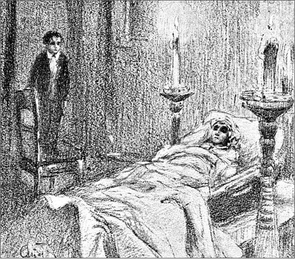 Я остановился у двери и стал смотреть; но глаза мои были так заплаканы и нервы так расстроены, что я ничего не мог разобрать; все как-то странно сливалось вместе: свет, парча, бархат, большие подсвечники, розовая, обшитая кружевами подушка, венчик, чепчик с лентами и еще что-то прозрачное, воскового цвета. Я стал на стул, чтобы рассмотреть ее лицо; но на том месте, где оно находилось, мне опять представился тот же бледно-желтоватый прозрачный предмет. Я не мог верить, чтобы это было ее лицо. Я стал вглядываться в него пристальнее и мало-помалу стал узнавать в нем знакомые милые черты. Я вздрогнул от ужаса, когда убедился, что это была она; но отчего закрытые глаза так впали? отчего эта страшная бледность и на одной щеке черноватое пятно под прозрачной кожей? отчего выражение всего лица так строго и холодно? отчего губы так бледны и склад их так прекрасен, так величествен и выражает такое неземное спокойствие, что холодная дрожь пробегает по моей спине и волосам, когда я вглядываюсь в него?..
