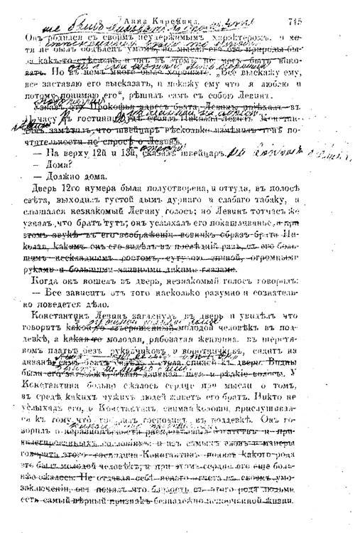 Страница текста «Анны Карениной», печатавшегося в «Русском вестнике» с исправлениями Толстого и H. Н. Страхова