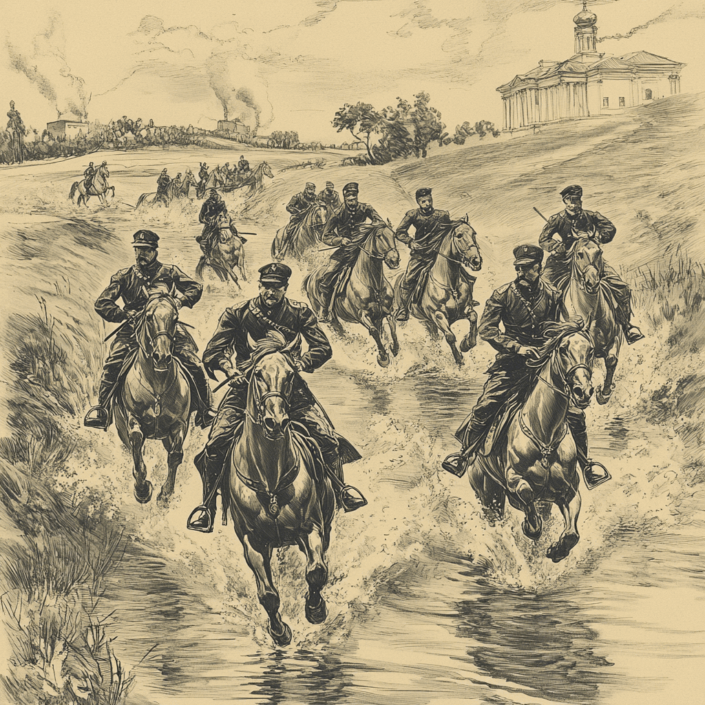 Всех офицеров скакало семнадцать человек. Скачки должны были происходить на большом четырехверстном эллиптической формы кругу пред беседкой. На этом кругу были устроены девять препятствий: река, большой, в два аршина, глухой барьер пред самою беседкой, канава сухая, канава с водою, косогор, ирландская банкетка, состоящая (одно из самых трудных препятствий) из вала, утыканного хворостом, за которым, не видная для лошади, была еще канава, так что лошадь должна была перепрыгнуть оба препятствия или убиться; потом еще две канавы с водою и одна сухая, – и конец скачки был против беседки. Но начинались скачки не с круга, а за сто сажен в стороне от него, и на этом расстоянии было первое препятствие – запруженная река в три аршина шириною, которую ездоки по произволу могли перепрыгивать или переезжать вброд.