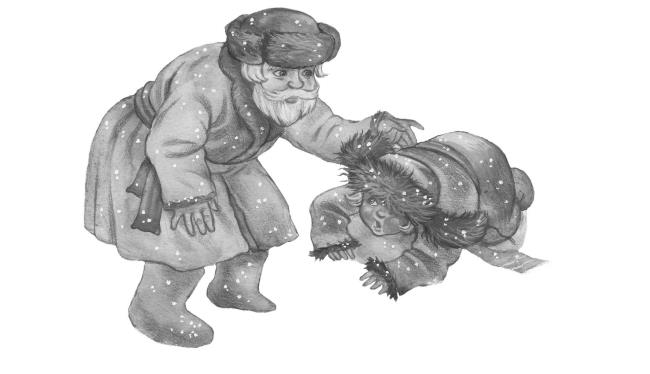 Тогда нянька взяла Кондрашку за уши и стала его целовать. Долго играли песни и плясали, а потом все ушли, и Кондрашка повёл няньку к себе домой.