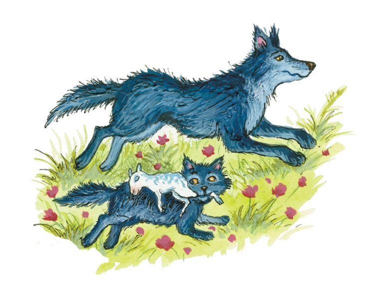 Как только старый волк увидал собак и народ, он подбежал к молодому, выхватил у него ягнёнка, перекинул себе на спину, и оба волка побежали скорее и скрылись из глаз.