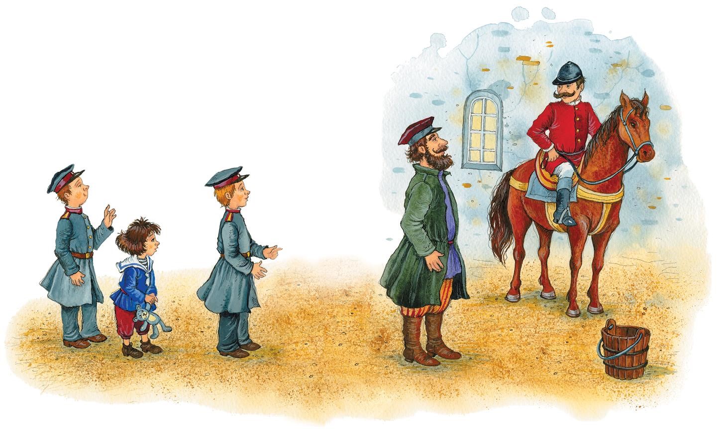 Когда пришла середа, нас троих повезли в манеж. Мы вошли на большое крыльцо, а с большого крыльца прошли на маленькое крылечко. А под крылечком была очень большая комната. В комнате вместо пола был песок. И по этой комнате ездили верхом господа и барыни и такие же мальчики, как мы. Это и был манеж. В манеже было не совсем светло и пахло лошадьми, и слышно было, как хлопают бичами, кричат на лошадей, и лошади стучат копытами о деревянные стены.