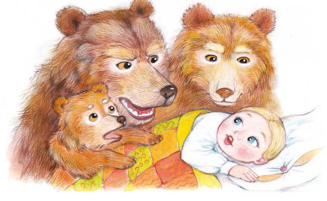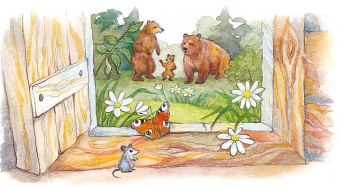 Дверь была отворена; она посмотрела в дверь, видит: в домике никого нет, и вошла. В домике этом жили три медведя. Один медведь был отец, звали его Михайло Иванович. Он был большой и лохматый. Другой была медведица. Она была поменьше, и звали её Настасья Петровна. Третий был маленький медвежонок, и звали его Мишутка. Медведей не было дома, они ушли гулять по лесу.