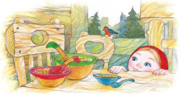 В домике было две комнаты: одна столовая, другая спальня. Девочка вошла в столовую и увидела на столе три чашки с похлёбкой. Первая чашка, очень большая, была Михайлы Иванычева. Вторая чашка, поменьше, была Настасьи Петровнина; третья, синенькая чашечка, была Мишуткина. Подле каждой чашки лежала ложка: большая, средняя и маленькая.