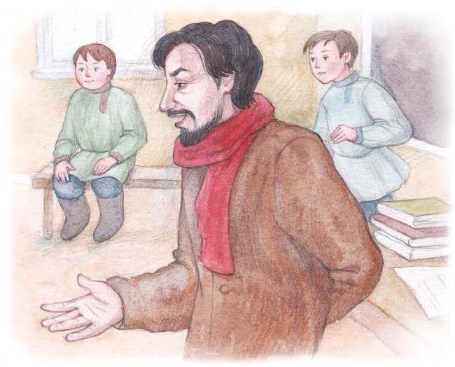 Филипок и пошёл в школу. В сенцах снял шапку и отворил дверь. Школа вся была полна ребят. Все кричали своё, и учитель в красном шарфе ходил посередине.