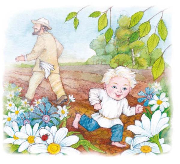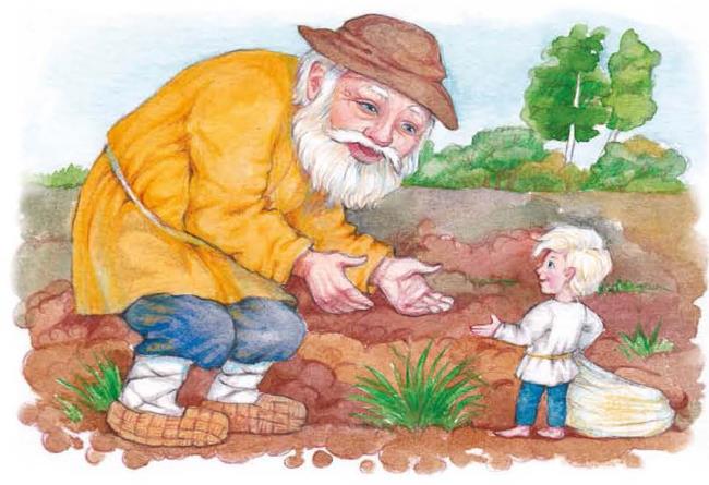 Старик услыхал с поля, кто-то его зовёт, пошёл к сыну навстречу, пересадил его через кочку и говорит: