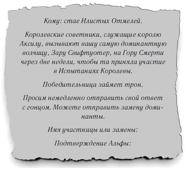Мои братья были недостаточно доминантными для того, чтобы стать альфой нашей стаи, и в то же время недостаточно покорными, чтобы о них заботились ее члены. Они боролись за ресурсы и должны были постоять за себя, как и большинство бета-волков. Если бы я приняла участие в испытаниях и победила, я не только стала бы королевой нашего народа, но и протолкнула бы обоих братьев туда, где им платили бы просто за то, что они дышат. Семья королевы ни в чем не нуждается. Каждую зиму новые меха, еда и кров – все преподносит в качестве даров король, кроме того, им отведены почетные места в волчьей королевской армии.