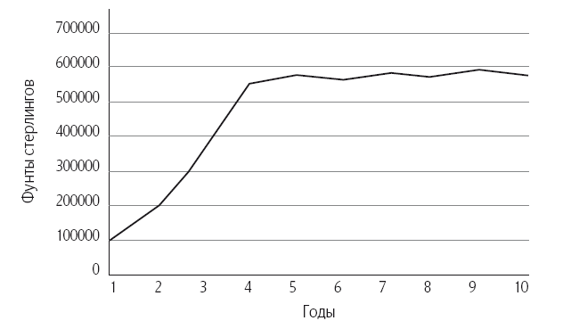 Этот феномен показан на примере графика ежегодной прибыли (рис. 1). В течение первых четырех лет бизнес развивался стремительно, а потом словно застрял на одном уровне, оставаясь на отметке чуть меньше 600000 фунтов стерлингов в последующие шесть лет. Этот сценарий – рост, за которым следует продолжительный застой, – свидетельствует о том, что бизнес столкнулся с барьером роста.