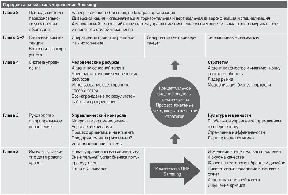 В главе 4 мы иллюстрируем изменения в стратегии, кадровой политике, административном управлении, а также в корпоративной культуре и ценностях, которые произошли в компании в результате внедрения «Новой управленческой инициативы». Эти основные элементы, наряду с лидерством и корпоративным управлением, составляют систему управления Samsung. Мы также в деталях описываем отличительные черты этих элементов. Затем следует анализ эволюции управленческой системы Samsung после появления «Новой управленческой инициативы».