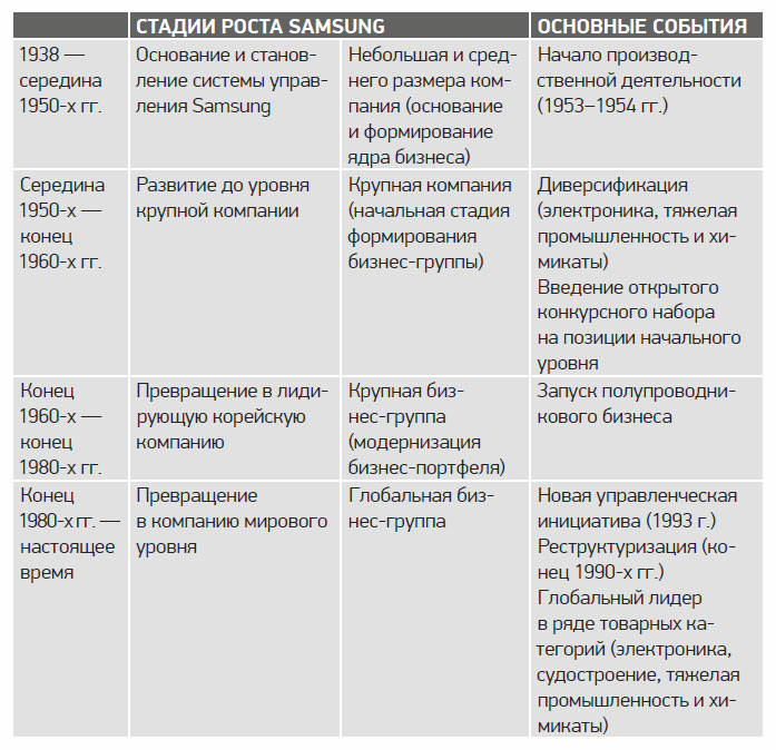 Историю Samsung можно поделить на четыре периода (см. таблицу 2.1): основание (с 1938 года до середины 1950-х годов), экспансия (с середины 1950-х до конца 1960-х годов), ведущая отечественная компания (с конца 1960-х до конца 1980-х годов), мировой лидер (с конца 1980-х годов по настоящее время).