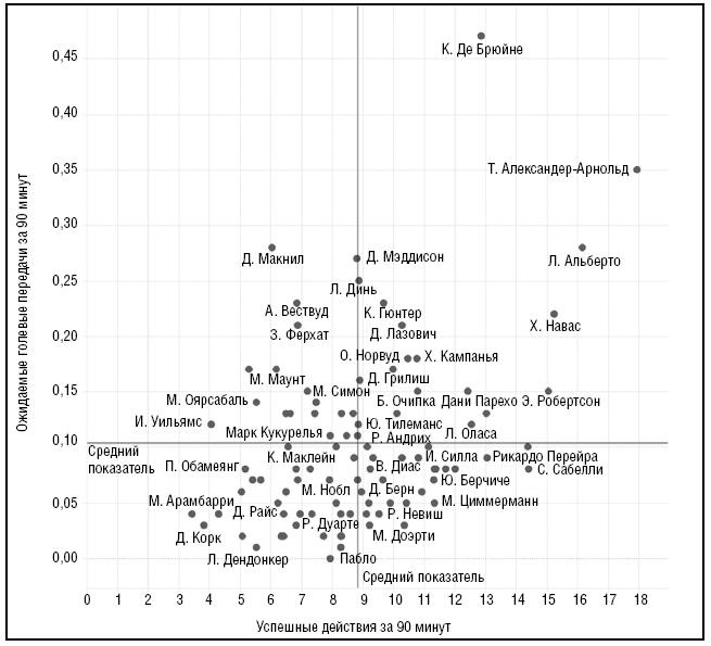 График на рис. 2 показывает, кто из игроков продвигает мяч вперед и создает хорошие моменты для своих команд. Для этого я придумал показатель – «успешные действия за 90 минут». Это комбинация показателей, которые «Вайскаут» (Wyscout) – итальянская компания, специализирующаяся на футбольной аналитике – называет «продвижение вперед» и «количество пасов вперед за 90 минут». Цель – определить, кто из игроков эффективнее продвигает мяч вперед на противоположную часть поля и в штрафную соперника. Второй показатель – «ожидаемые голевые передачи» (xA), который вычисляется тем же образом, что и всем известные «ожидаемые голы» (xG), – показывает вероятность того, что шанс, созданный игроком, превратится в гол. Я взял информацию по пяти главным европейским чемпионатам и вычислил игроков, которые сыграли более 1000 минут в сезоне-2019/20. Мы сразу же можем заметить двух явных лидеров.