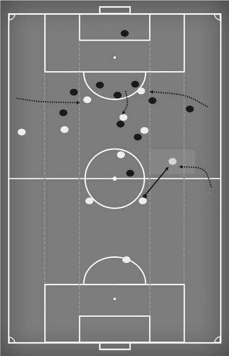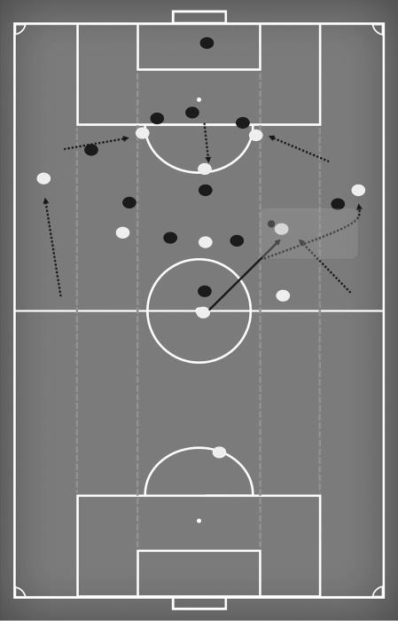 На рис. 6 можно увидеть полный спектр движений «Ливерпуля» по новой структуре. Александер-Арнольд смещается в поисках свободного пространства для получения паса, когда левый центральный защитник Вирджил ван Дейк владеет мячом. В этот момент Джордан Хендерсон смещается со своей центральной позиции на правый фланг, Мохаммед Салах и Садио Мане смещаются внутрь, Роберто Фирмино уходит с позиции центрального нападающего, чтобы занять место в глубине поля. Эндрю Робертсон незамедлительно продвигается вперед, чтобы занять свободное пространство, которое осталось на левом крае после смещения Мане. На этой картинке просматривается сбалансированная структура, которая получается у «Ливерпуля» вследствие разных перемещений. Есть игроки на флангах, которые держат ширину атаки, при этом создается перегруз в центральной зоне перед штрафной соперника.