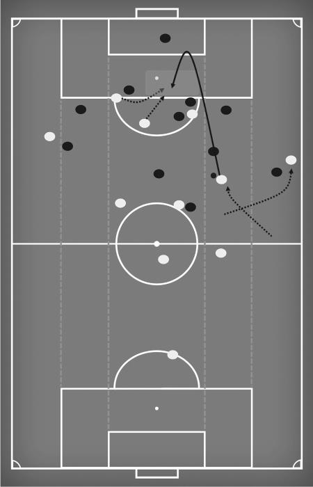 После всех этих перемещений Александер-Арнольд двигается в полуфланг, чтобы получить мяч в свободной зоне. Как только это происходит, он начинает искать возможность доставить мяч в штрафную соперника.