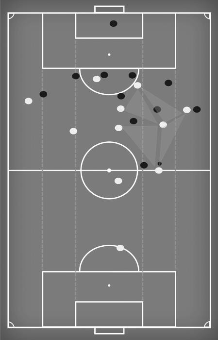 На рис. 7 можно увидеть, почему эта позиция так важна в структуре «Ливерпуля». Пять игроков выстраиваются вокруг Александера-Арнольда, когда он находится в полуфланге. Он – ключевой элемент структуры: его позиция создает несколько треугольников, что дает возможность быстро двигать мяч и менять направление атаки. Эта структура позволяет доставить мяч Мохаммеду Салаху, как только он смещается с правого фланга в пустое пространство, созданное за счет отхода Роберто Фирмино на позицию номера «10».