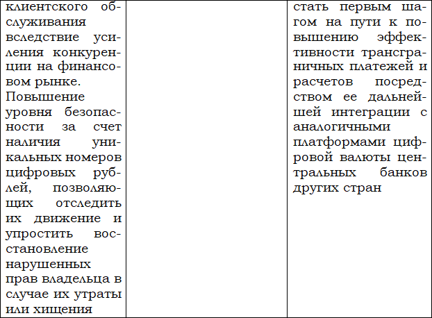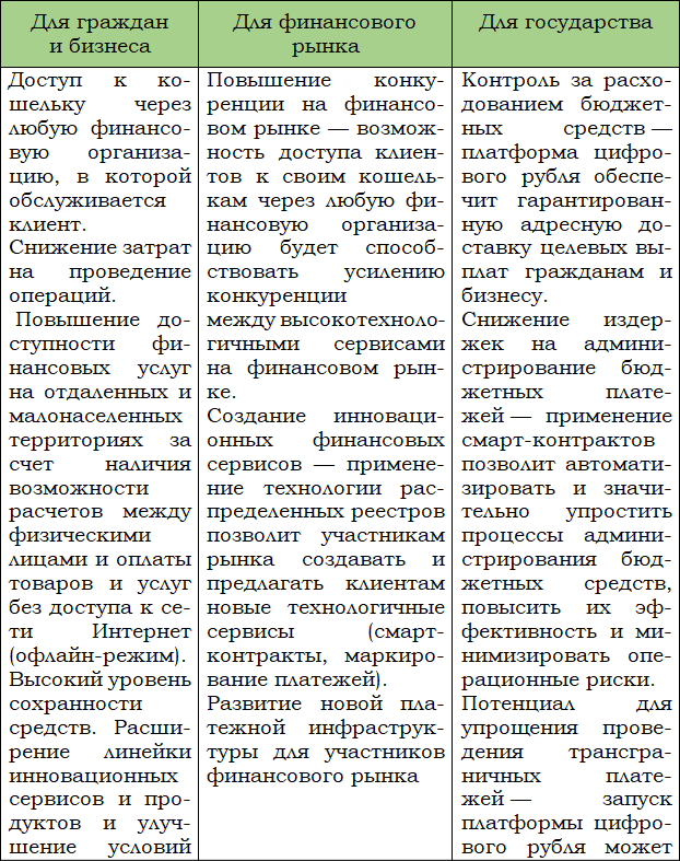 В Концепции цифрового рубля показаны преимущества его введения для граждан, бизнеса, участников финансового рынка и государства (таблица 3).