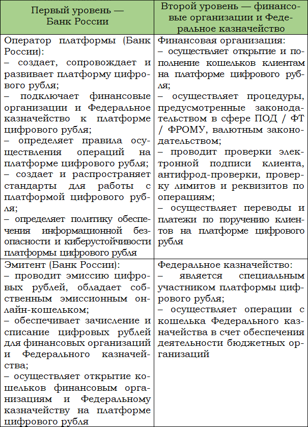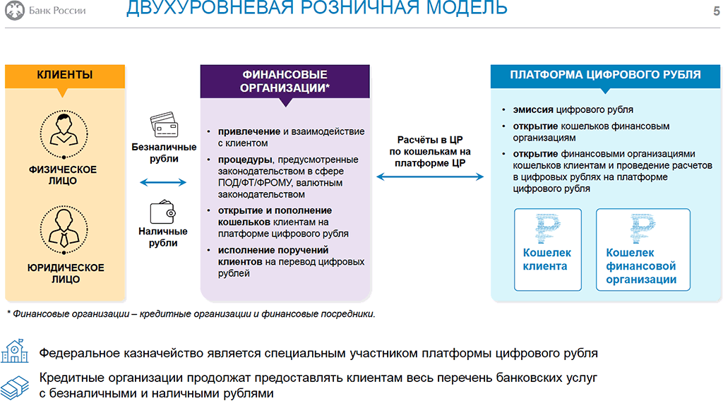 Банк России открывает кошельки[17] финансовым организациям и Федеральному казначейству, а финансовые организации открывают кошельки клиентам на платформе цифрового рубля.