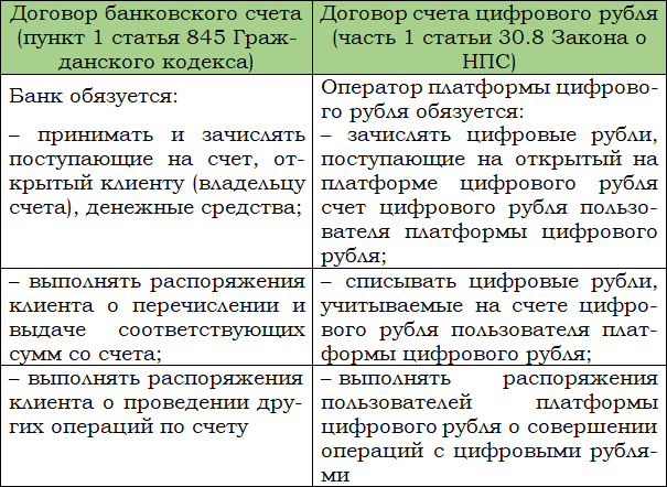 «По договору счета цифрового рубля оператор платформы цифрового рубля обязуется зачислять цифровые рубли, поступающие на открытый на платформе цифрового рубля счет цифрового рубля пользователя платформы цифрового рубля, списывать цифровые рубли, учитываемые на счете цифрового рубля пользователя платформы цифрового рубля, а также выполнять распоряжения пользователей платформы цифрового рубля о совершении операций с цифровыми рублями».