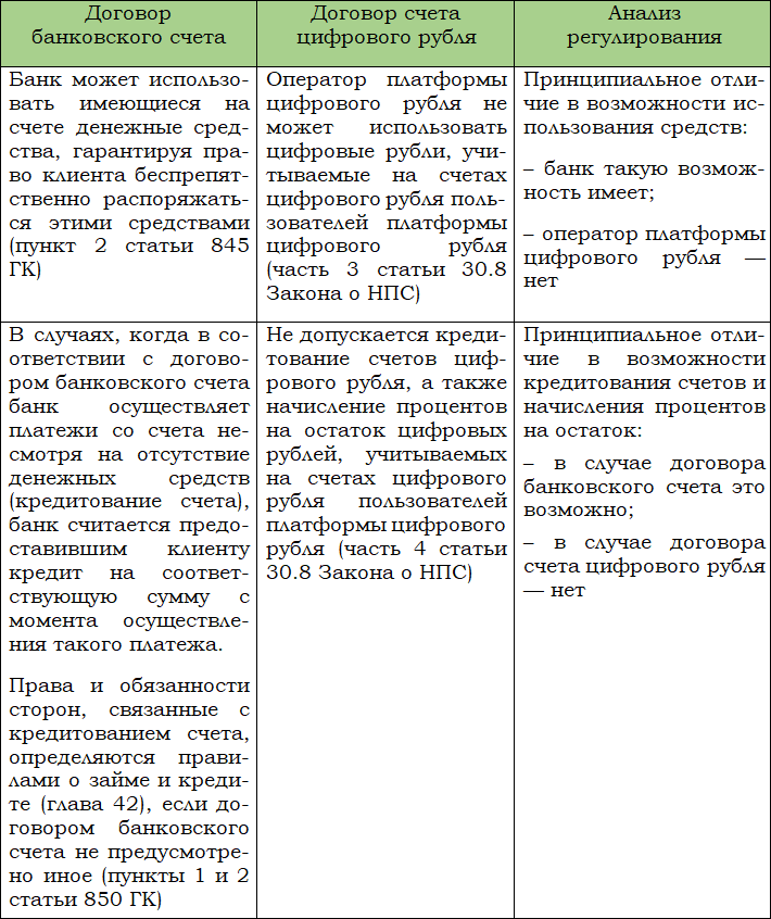 Проанализируем положения статьи 30.8 Закона о НПС и сравним предусмотренные данной статьей положения с нормами, определяющими аналогичные вопросы договора банковского счета и предусмотренными главой 45 Гражданского кодекса. Это позволит увидеть особенности договора счета цифрового рубля как отдельного вида банковского счета.
