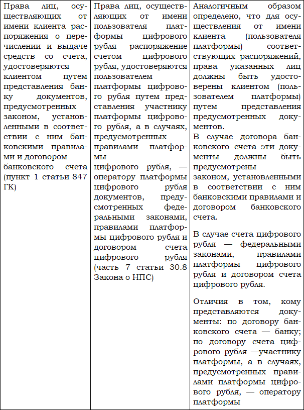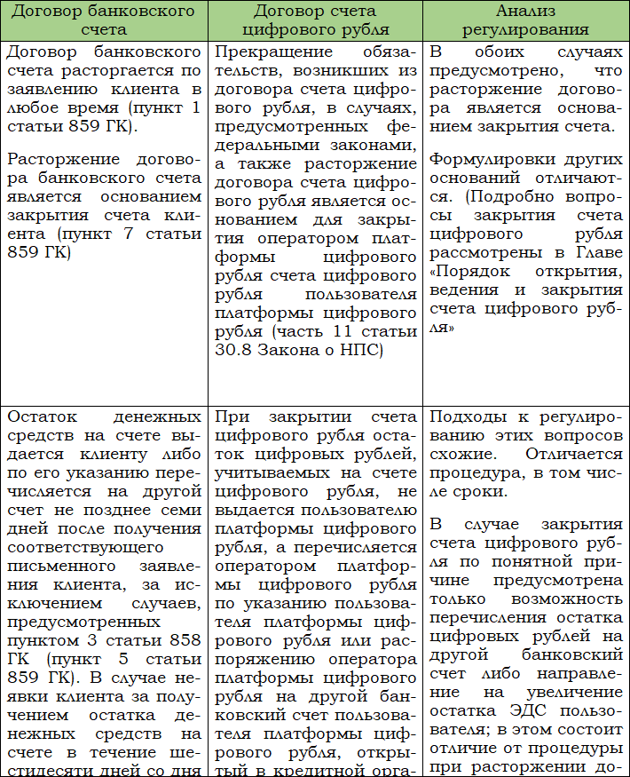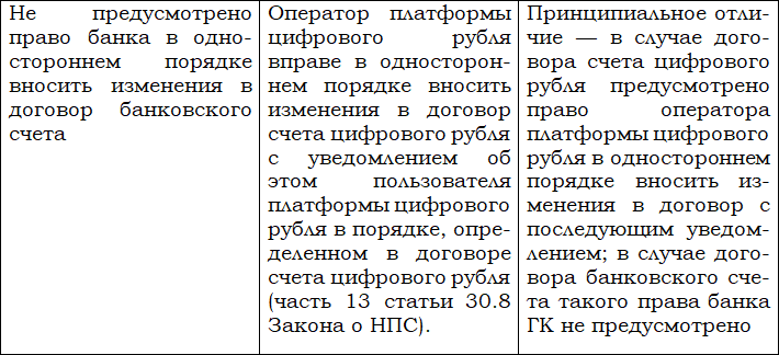 В таблице 16 показаны положения законодательных актов, регулирующие отдельные положения договора счета цифрового рубля и банковского счета принципиально отличным образом. Таких положений четыре, но они имеют существенное значение.