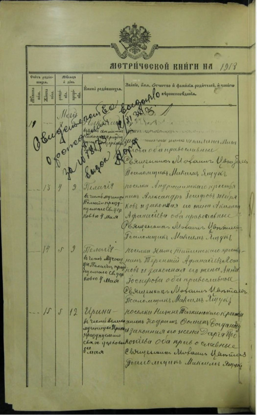 5 мая 1913 года рождена, 9 мая крещена Пелагея в честь мученицы Пелагеи празднуемого Св. церковью 4 мая. Посёлка Нижне Татьинского крестьянинъ Терентий Афанасьевъ Логинов и законная его жена Анна Иосифова, оба православные
