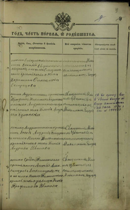 Восприемниками стали посёлка Андрюшинского крестьянин Абрам Макарьев Лосев и посёлка Нижне Татьинского крестьянская девица Ефвимия Иоанова Фёдорова.