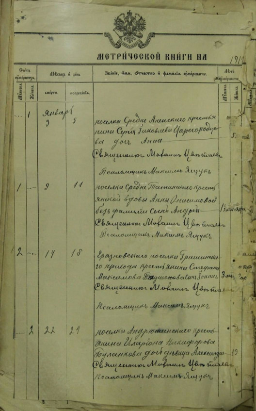 9 января 1914 умер, 11 погребен Поселка Средне-Татинского крестьянской вдовы Анны Онисимовой без фамилии сын Андрей возраста 1 год и пол месяца.