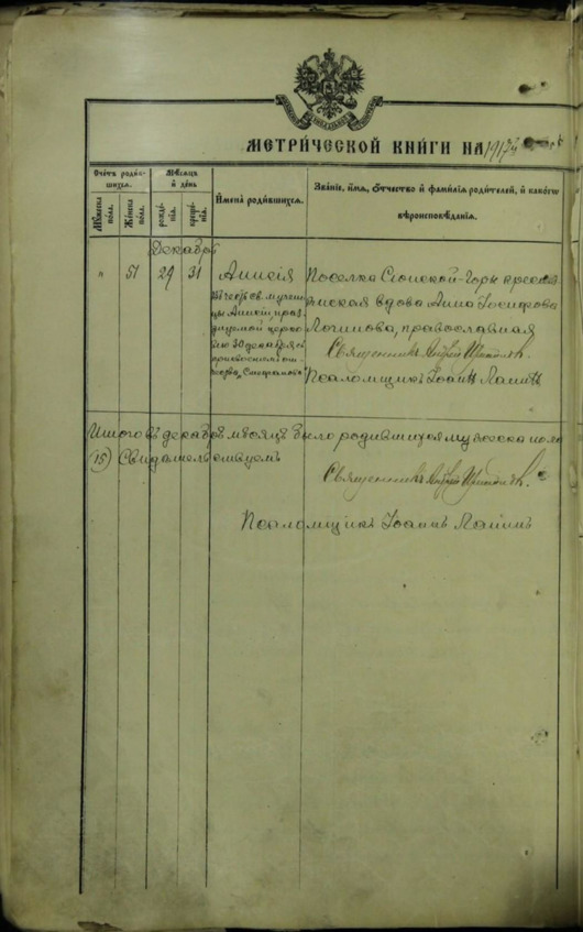 Бабушкина сестра Анисья (Оня) родилась 29 декабря 1917 года. Матерью записана: «Посёлка Сионской горы крестьянская вдова Анна Иосифовна Логинова, православная»
