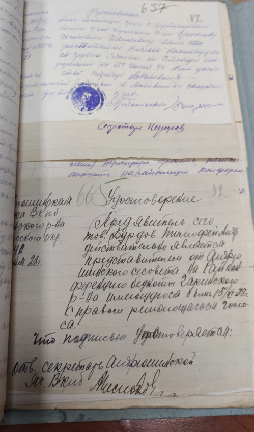 Удостоверение: Предъявитель сего тов. Бурдов Тимофей Андреевич действительно является представителем от Андрюшинского сельсовета на районную конференцию бедноты Гаринского района, имеющегося быть 15/6—28 года с правом решающего голоса, что подписью удостоверяется. Ответственный секретарь Андрюшинской ячейки ВКП (б) подпись